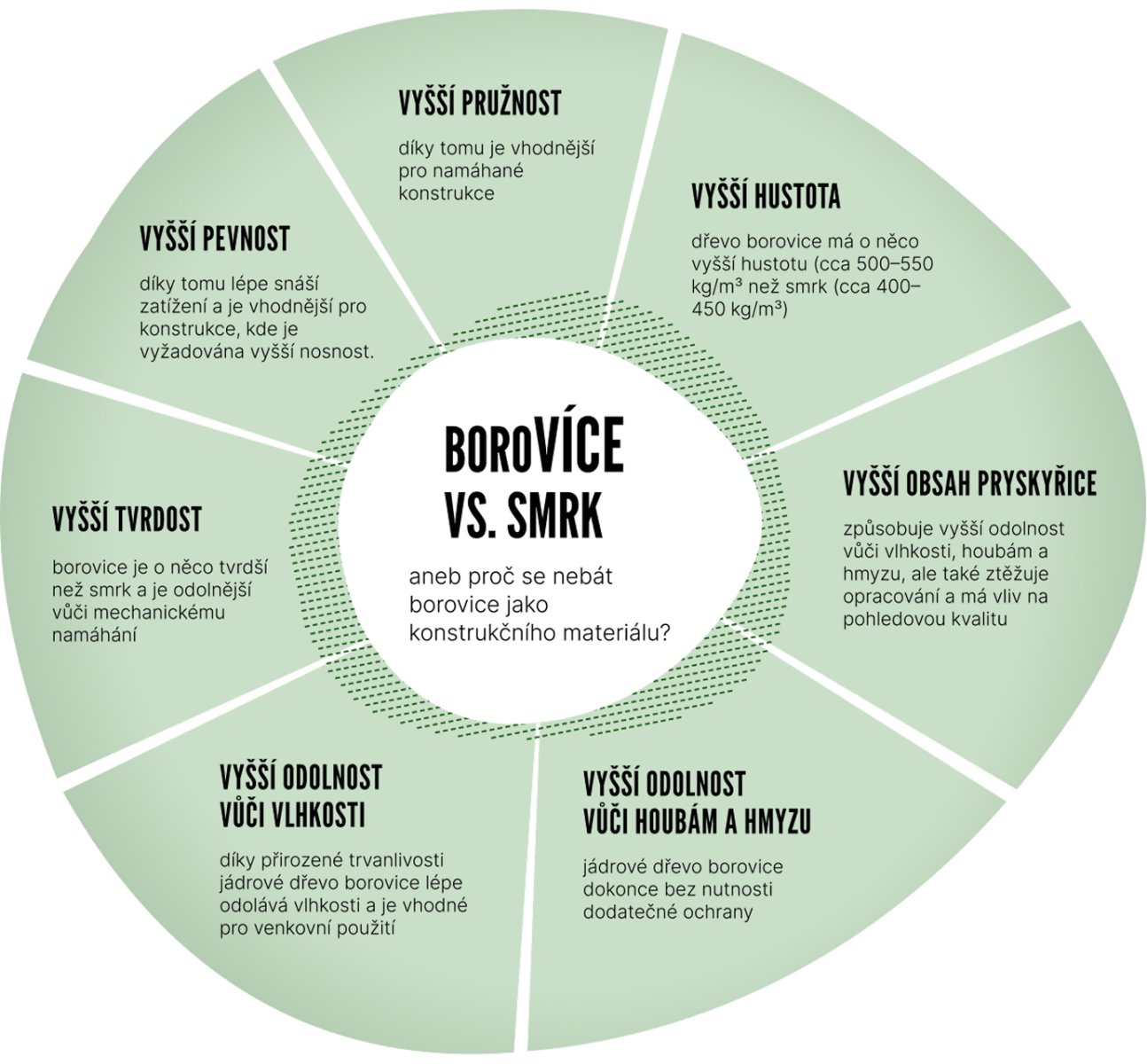 Borovice a smrk patří mezi nejpoužívanější jehličnaté dřeviny u nás. Smrk má světlejší dřevo s rovnoměrnou strukturou, které se snadno opracovává, ale je méně odolné proti vlhkosti. Borovice, zejména pak její jádrová část, má v porovnání se smrkem dřevo tvrdší, pryskyřičnatější a trvanlivější, takže lépe odolává povětrnostním vlivům.